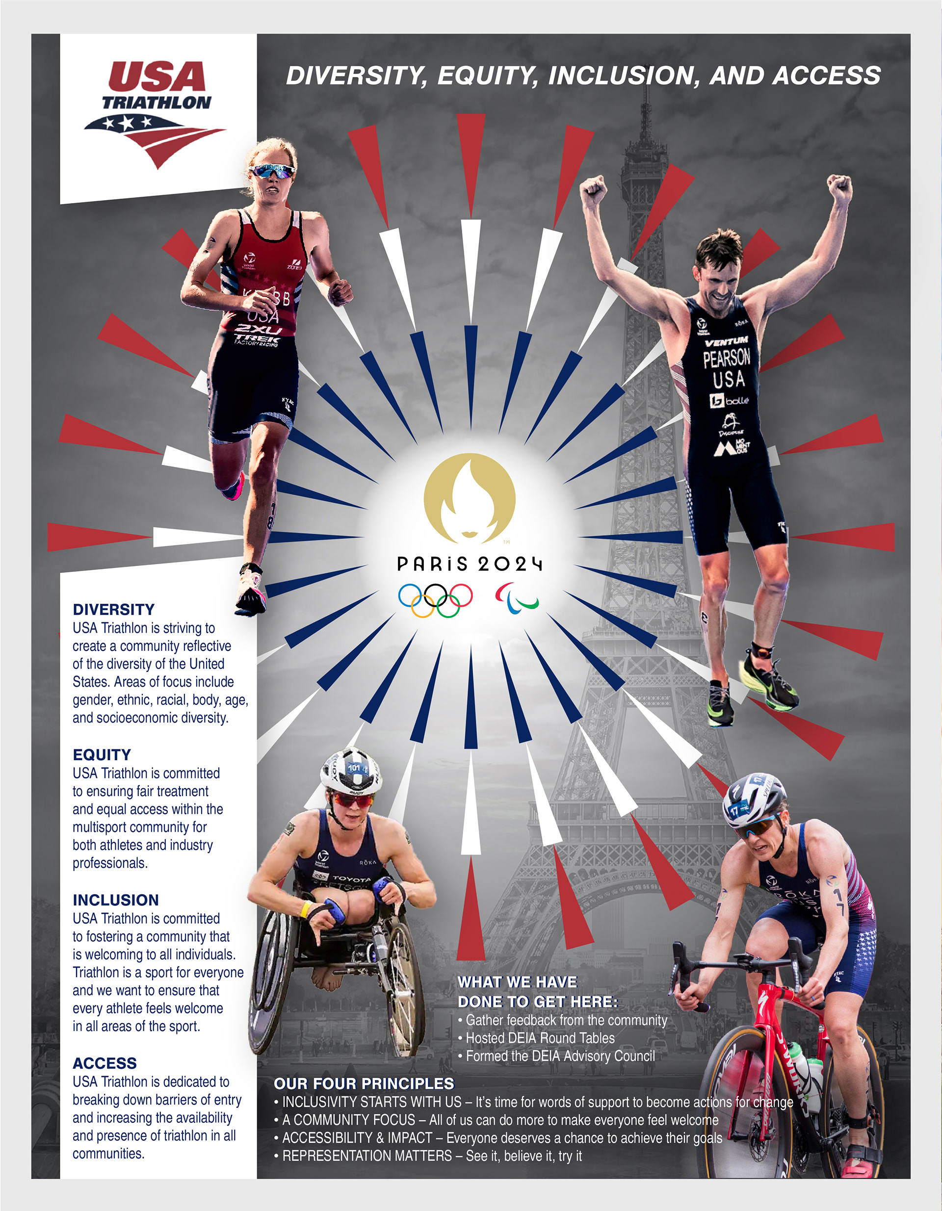 Full page cover for story highlighting Diversity Equity, Inclusion and Access for USA Triathlon Paralympic Team leading into the 2024 Paris Paralympics.